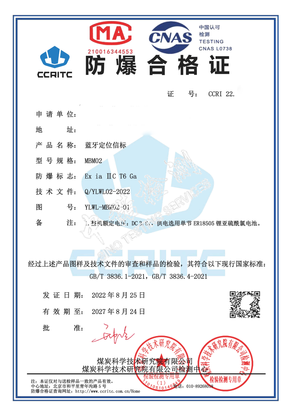 中諾檢測(cè)成本辦理的藍(lán)牙定位信標(biāo)的防爆標(biāo)志:Ex ia ⅡC T6 Ga